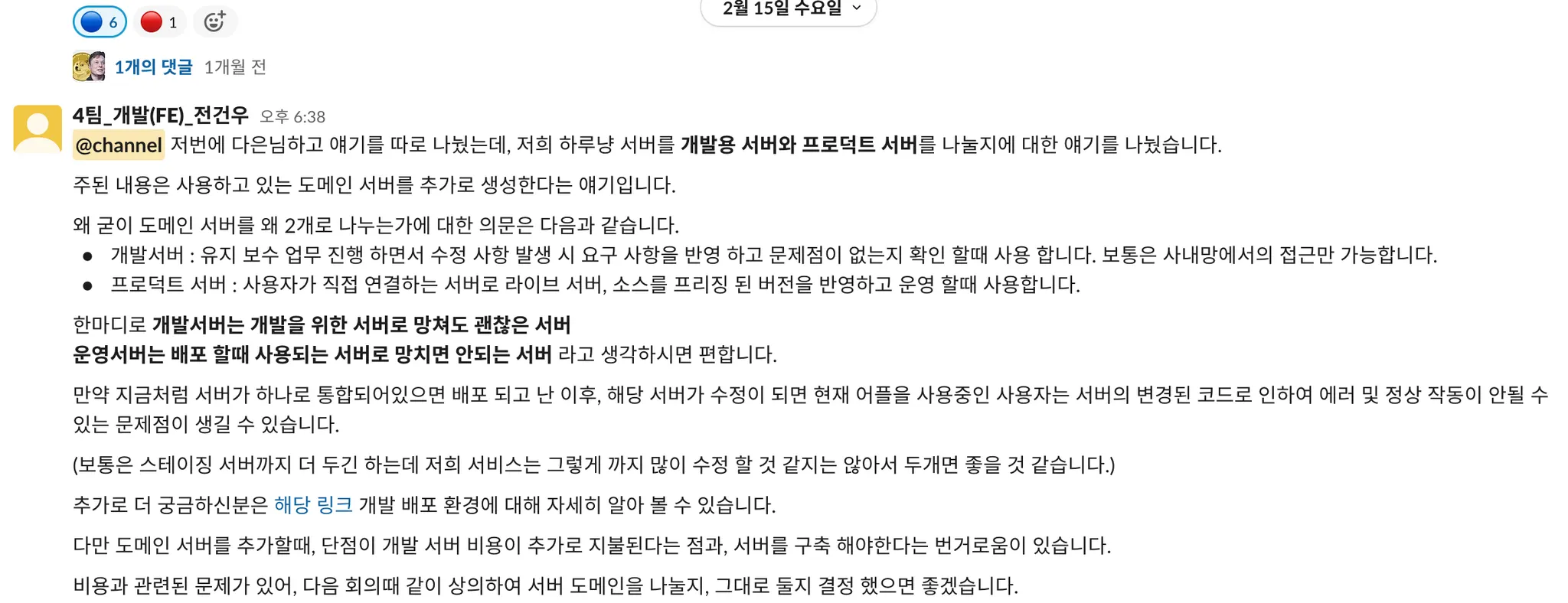 개발용 서버와 프로덕트 서버에 대한 논의 결정 사항을 채널에 공유한 내용