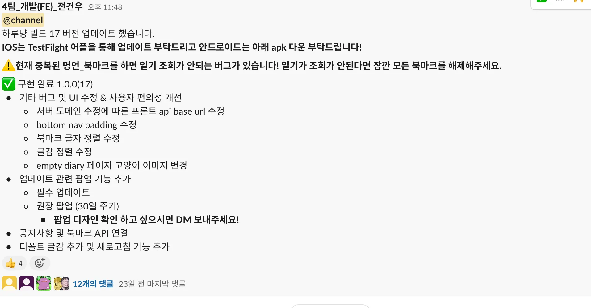 각 버전에 해당하는 어플을 배포 할때마다 주의사항하고 어떤 이슈가 있는지 배포를 하며 알립니다.